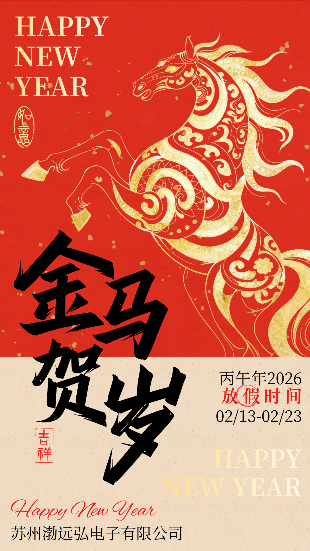 尊敬的各位客户、亲爱的全体同事: 岁序更替,华章新启;马年迎春,喜乐相伴。马年新春将至,【苏州渤远弘电子有限公司公司】谨向各位客户致以诚挚的问候,感谢大家长期以来的信任……