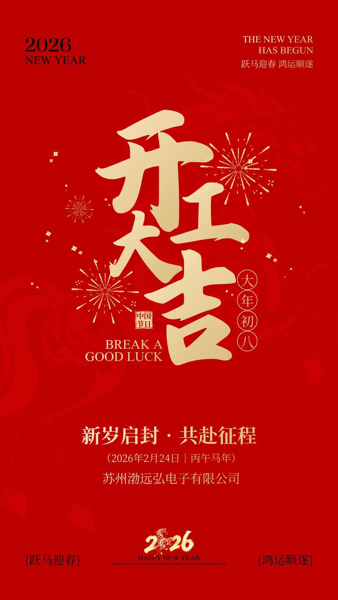 策马扬鞭,再启新程!2026 年,[苏州渤远弘电子有限公司] 已正式开工。感谢您过去的信任与支持,新的一年,我们将继续以饱满的热情、专业的服务,与您携手共赢,马到成功!…