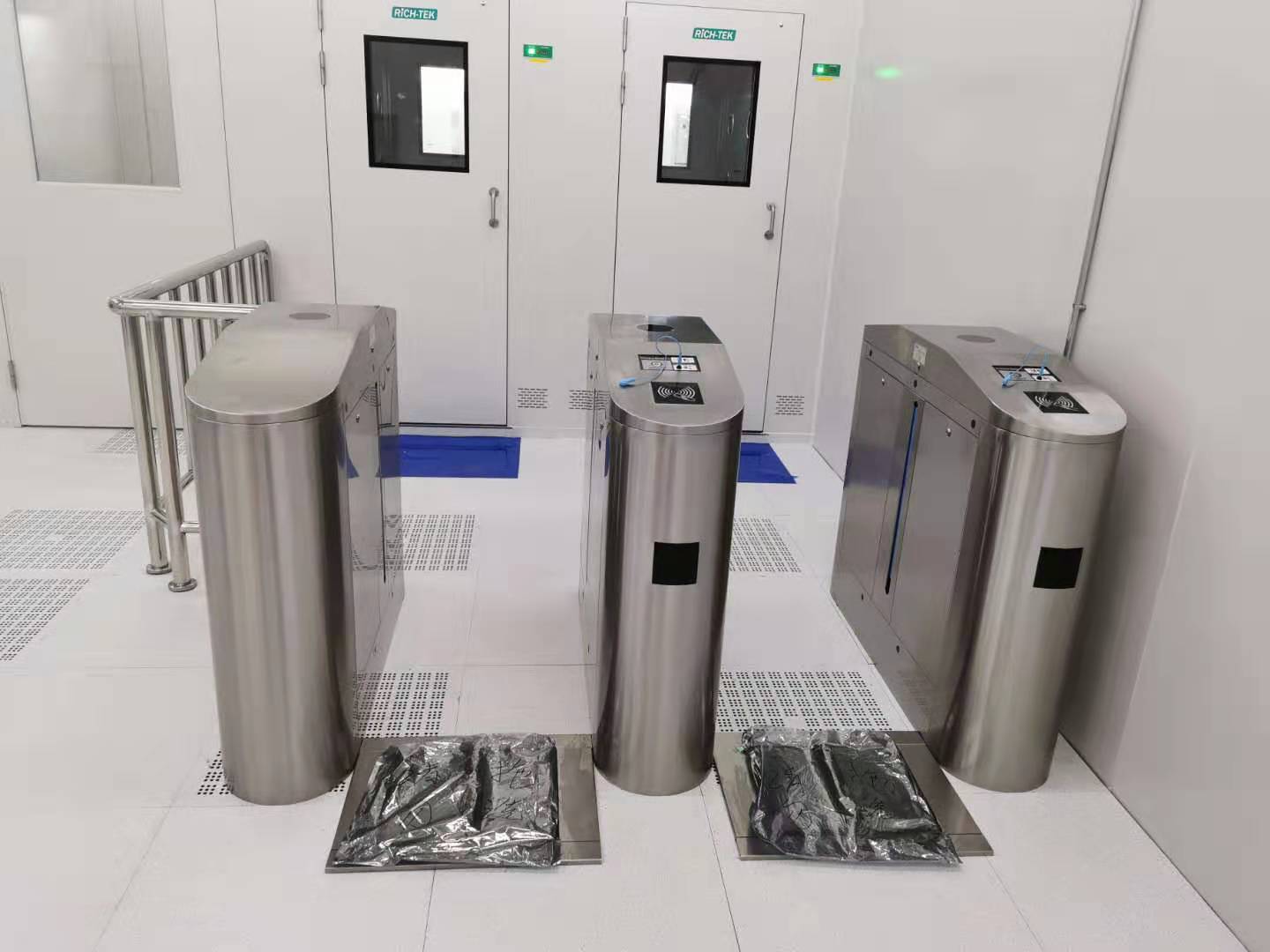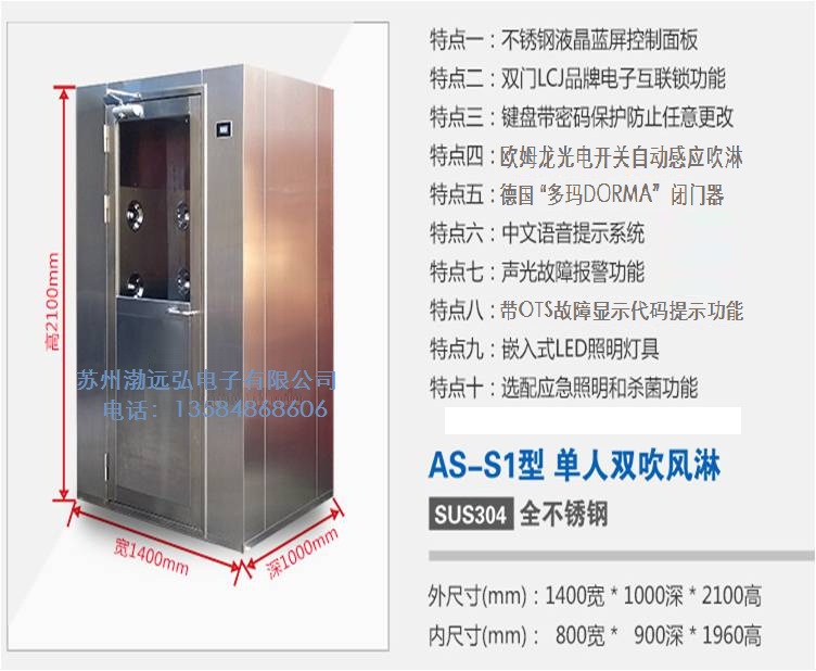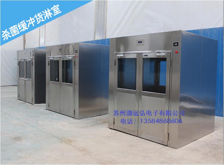 1 防静电风淋室外箱体一般采用冷转钢板白色烤漆经过防静电喷漆或者采用SUS304不锈钢制作完成,两侧配备风机和高效过滤器,风淋时间可调,消静电离子棒分别安装于风淋室风机出风口两侧;